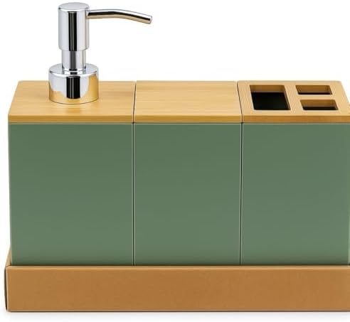 Bambu Kapaklı Yeşil Banyo Seti – Sıvı Sabunluk, Diş Fırçalık, Çok Gözlü Organizer ve Düzenleyici