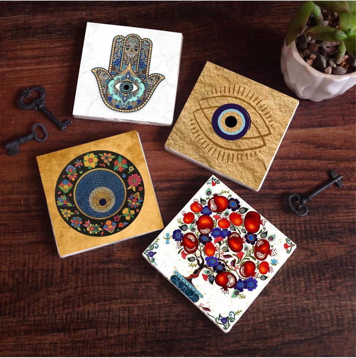 Nazar, Nar Ağacı, Fatma Ana Eli Taş Bardak Altlığı Seti – 4 Parça – Dekoratif, Rustik Mutfak Aksesuarı, 10×10 cm, Kaydırmaz Tabanlı, Şık ve Dayanıklı SC509