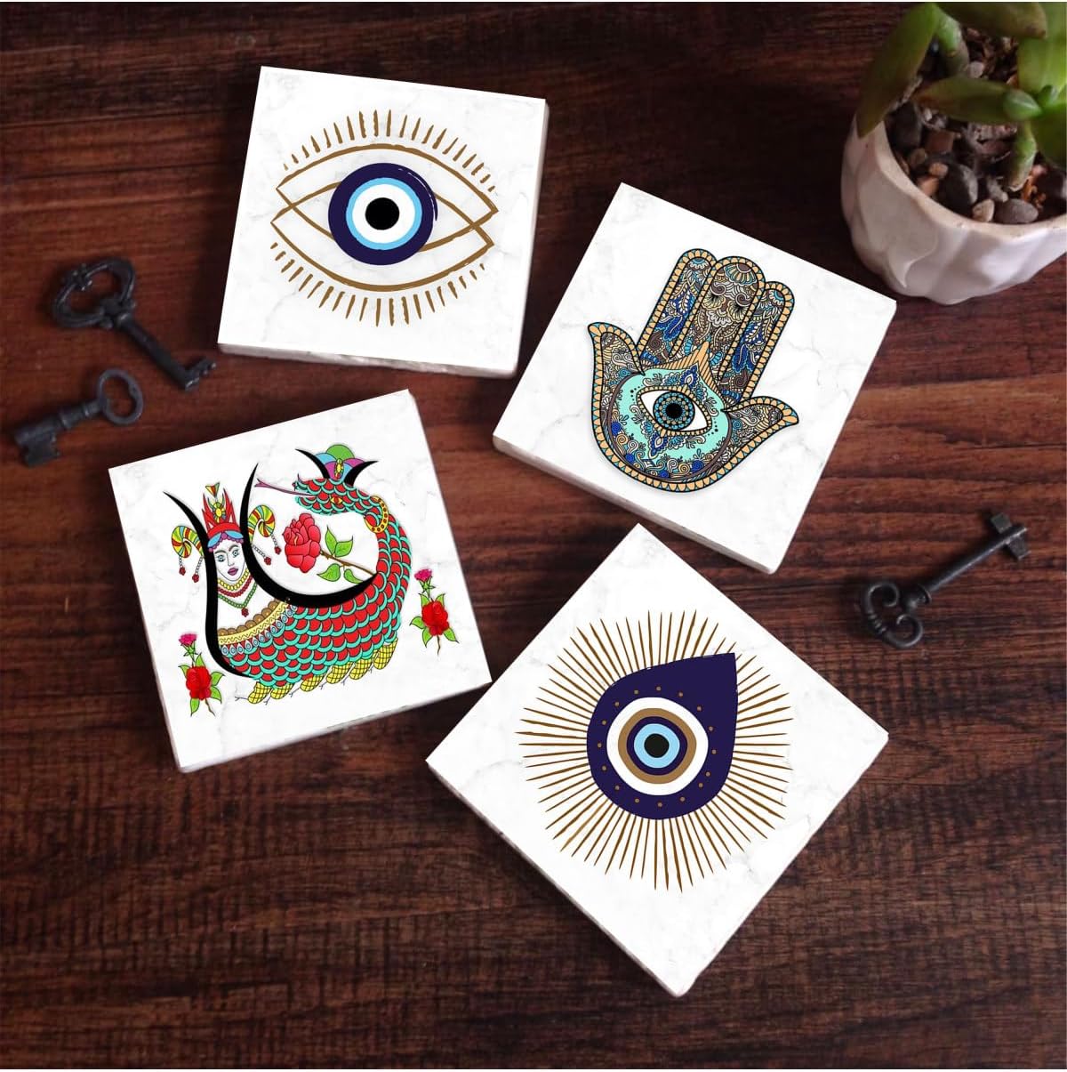 Nazar, Mandala, Fil, Şahmeran Taş Bardak Altlığı Seti – 4 Parça – Dekoratif, Rustik Mutfak Aksesuarı, 10×10 cm, Kaydırmaz Tabanlı, Şık ve Dayanıklı SC124