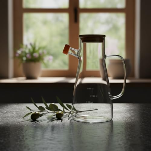 1 Adet 900 ML Bambu Kapaklı Borosilikat Cam Yağlık ve Sirkelik, Dayanıklı ve Ölçekli Tasarım, Damlatmaz Ağızlı Modern Mutfak Sosluk Şişesi