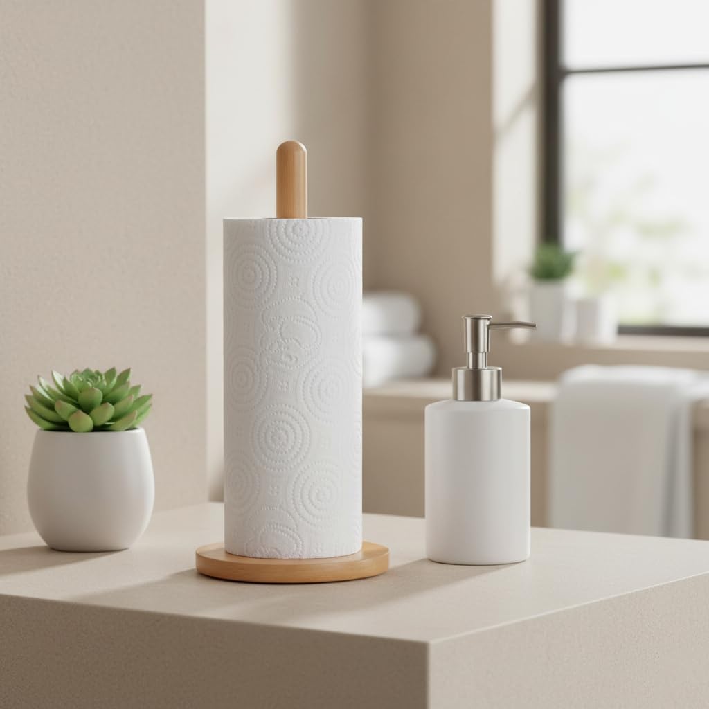 Doğal Bambu Ahşap Kağıt Havluluk, Yuvarlak Tabanlı Tezgah Üstü Dikey Havlu Standı, Mutfak ve Banyo İçin Dekoratif Peçetelik Organizer