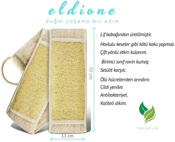 Çift Taraflı Temizlik Deneyimi: Ön yüzeyi doğal Mısır kabak lifinden, arka yüzeyi ise su tutmayan, hızlı kuruyan Rovin kumaştan üretilmiştir. Derinlemesine temizlik sunar, cilde zarar vermeden ölü deriyi arındırır. Uzun ve Kulplu Yapı – Sırtınıza Kolay Ulaşım: 70 cm uzunluğundaki tasarımı ve iki ucundaki kulpları sayesinde sırtınızın en zor bölgelerine bile kolayca ulaşmanızı sağlar. Ergonomik yapısıyla kullanım kolaylığı sunar. Selülit Karşıtı ve Cilt Canlandırıcı Etki: Peeling etkisiyle selülit oluşumunu azaltmaya yardımcı olur. Masaj etkisiyle kan dolaşımını artırır, cildin genç ve canlı görünmesine katkı sağlar. Hijyenik ve Dayanıklı Malzeme: Rovin kumaş havlu kumaş değildir; ince dokulu, nefes alabilir ve hızlı kurur. Kese kullanımı sonrası kötü koku oluşumunu engeller, daha hijyenik bir bakım sunar. Çevre Dostu ve Doğal Seçim: Kimyasal içermez, plastik kullanılmadan üretilmiştir. Sürdürülebilir, doğa dostu ambalaj ile gönderilir. Kendiniz ve doğa için doğru tercih. Dikiş Kalitesi sayesinde yırtılma ve sökülmelere karşı ekstra dayanıklıdır. eldione Doğal Kabak Lifi Sırt Kesesi –Çift Taraflı Peeling Lifi, 70×11 cm, Uzun Kulplu, Selülit Karşıtı, Rovin Kumaşlı, Cilt Temizleyici Yenileyici Canlandırıcı Etki, Hücre Yenileme,Exfoliating Kese