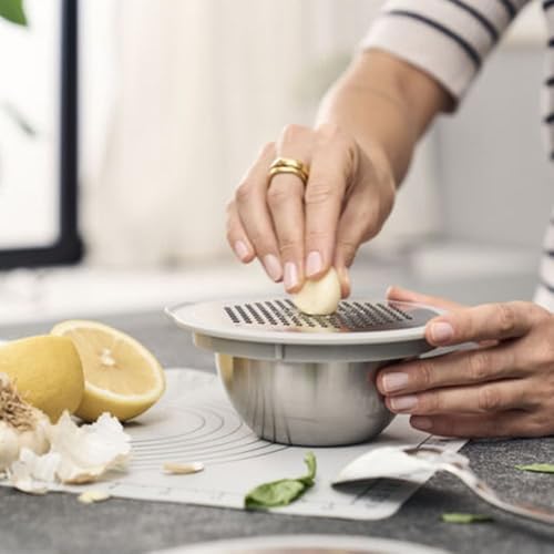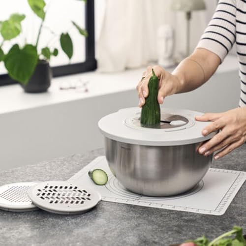 Fresh ve Bowls için sıçrama koruması, üç rende aparatı ve fırına dayanıklı kaymaz silikon mat içeren aksesuar seti Sapı olmayan kaseler ve Ceramique 18 ve 24 santimetre kaseler için uyumlu sıçrama koruyucu kalın rendeleme, ince rendeleme ve dilimleme için üç farklı rende Çift yönlü rendeleme teknolojisine sahip Z-Cut tasarımlı rendeler Fresh & Save Bowls Vakumlu Saklama Kabı Aksesuar Seti, S/M/L, 5 Parça