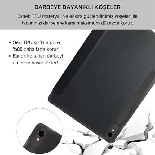 Galaxy Tab S9 FE 10.9 inç Uyumlu Smart Kılıf, S Pen Kalemlikli, Trifold, Esnek, Mat, Darbeye Tam Dayanıklı Tablet Kılıfı (Siyah)