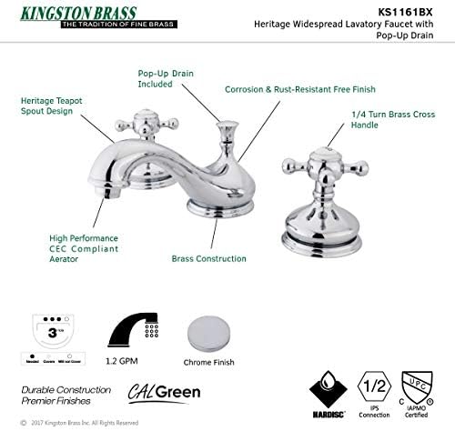 Masif pirinç yapı. Damlama yapmayan seramik disk kartuşu. Tezgah üstü montaj, 20,3 cm ila 40,6 cm geniş aralıklı 3 delikli tesisat. 4 Bar basınçta musluk akış debisi 4,5 LPM (1,2 GPM). Standart 1/2 inç (1,2 cm) IPS bağlantısı. KS1161BX Widespread Lavatory with Metal cross handle, Polished Chrome