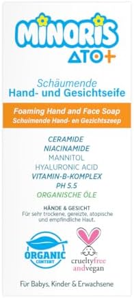 Minoris Ato+ Köpük El ve Yüz Temizleme Sabunu Minoris ATO+ Köpük El Sabunu Hassas, çok kuru ve atopik, atopiğe eğilim gösteren ciltlere özel besleyici, yeniden yapılandırıcı, yoğun nemlendirici 300 ml