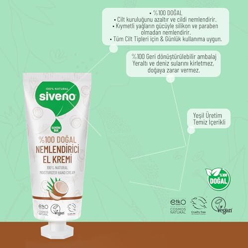 %100 Doğal El ve Vücut Kremi Hindistan cevizi yağı, cilt kuruluğunu azaltmaya yardımcı olan ve cildin nemi tutmasını sağlayan laurik asit gibi yağ asitlerinden oluşur. Hindistan Cevizi Yağı: Cildin görünüm kalitesini arttırmada yardımcı olur. Avokado Yağı: Kuru veya çatlamış ciltler için nemlendirme kapasitesi yüksektir. Alkol ve boya İÇERMEZ! Siveno%100 Doğal El ve Vücut Kremi Hindistan Cevizi Avokado Yoğun Nemlendirici Onarıcı Vegan 30 ml