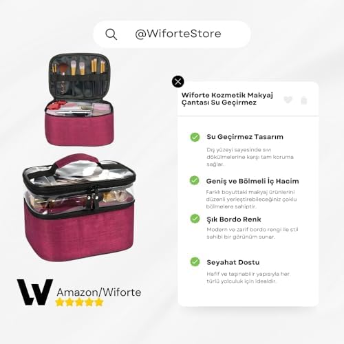 Wiforte Su Geçirmez Seyahat Tipi Makyaj Çantası – Büyük Boy, Çok Bölmeli Kozmetik ve Makyaj Seti Düzenleyici Kutusu (Bordo)