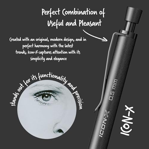 -X ile yaz, çiz ve eğlen Siyah metal aksesuarlar ve tepeden muhafazalı silgi Tepeden basmalı mekanizmaya ve metal gövdeye sahiptir 0.5 milimetre mekanik kurşun kalem uç -X Metal Versatil 0.5 Mm Mat Siyah